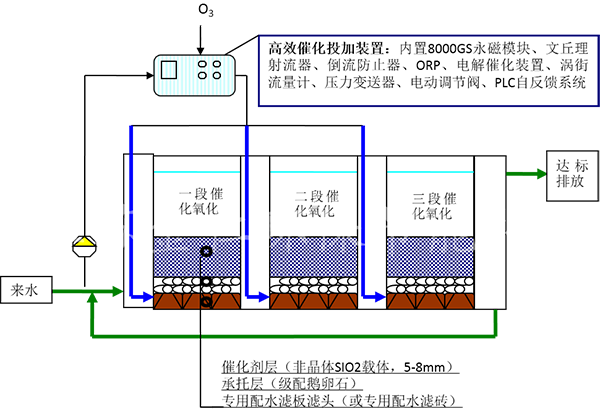 通過高效催化投加裝置后的臭氧和水的混合液,由增效噴嘴進(jìn)入專業(yè)設(shè)計的氣水分配濾磚均勻進(jìn)入貴重金屬的催化劑層,催化劑表面具有外墻電位,有效的激發(fā)產(chǎn)生羥基自由基,羥基自有基的氧化還原電位為E0=2.8ev,在如此高的氧化電位的作用下大部分難降解的有機(jī)物發(fā)生斷鏈反應(yīng)形成短鏈的有機(jī)物或直接被氧化至CO2和H2O,最終出水可達(dá)設(shè)計排放標(biāo)準(zhǔn)。永磁高級催化氧化系統(tǒng)的工藝流程如下所示: